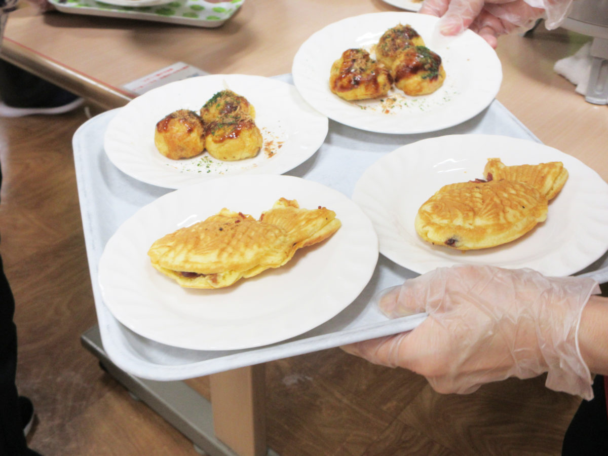 志摩豊和苑 通所リハビリで、「手作りのたい焼きとたこ焼き」のおやつのイベントが開催しました。